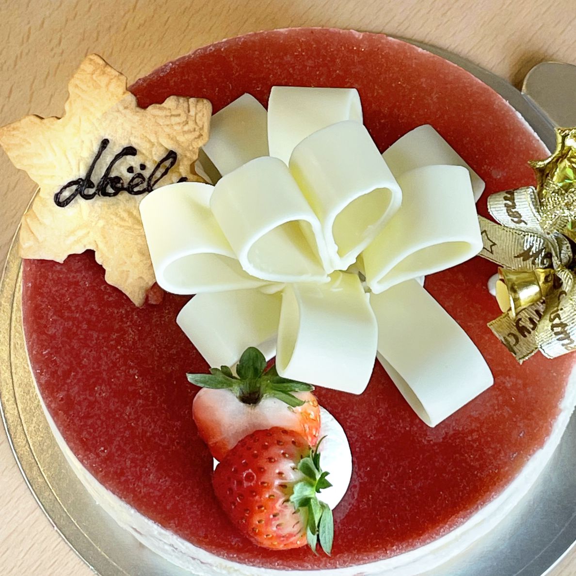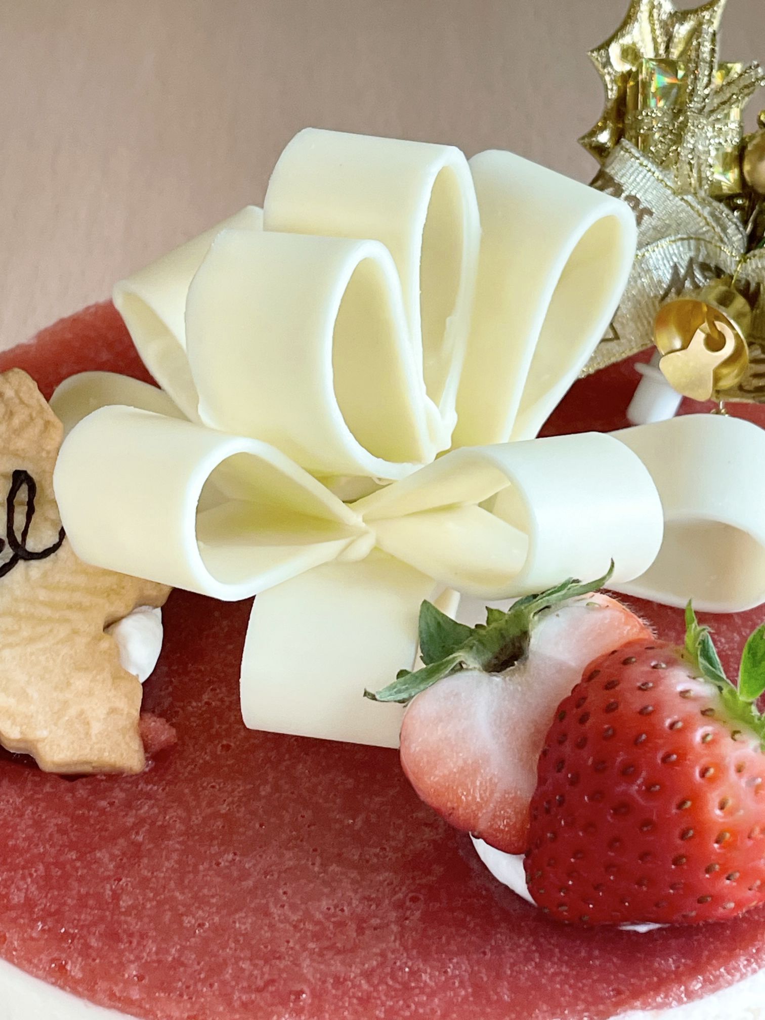 フラリエボンボン 人気のいちごのティラミスをX'masケーキに仕上げました。いちごのシロップを染みこませたビスキュイをマスカルポーネで サンドして、大きなホワイトチョコのリボンをあしらいました。 贈り物の箱を開けるように、ワクワクを一緒に楽しむいちごのティラミスです。