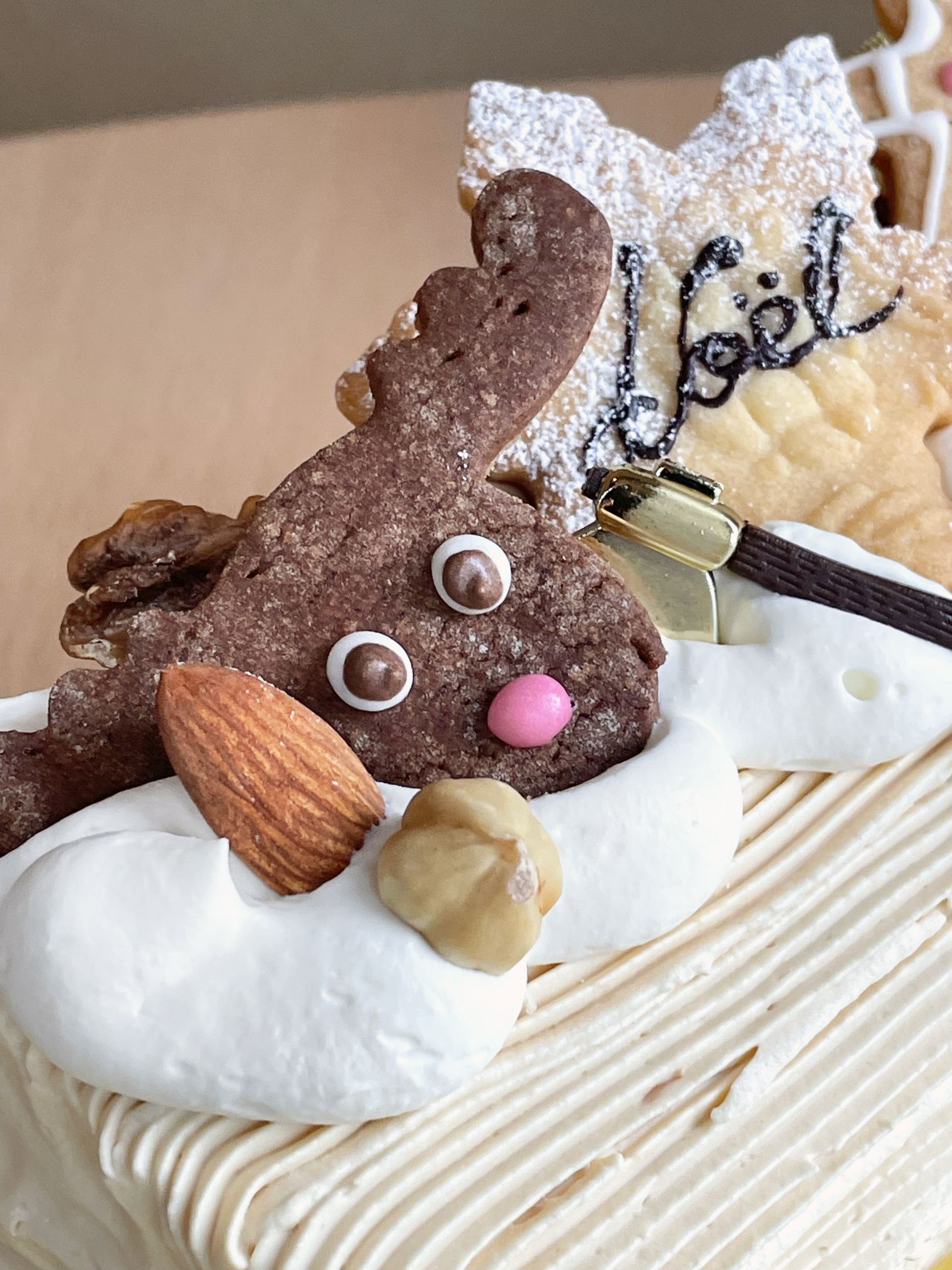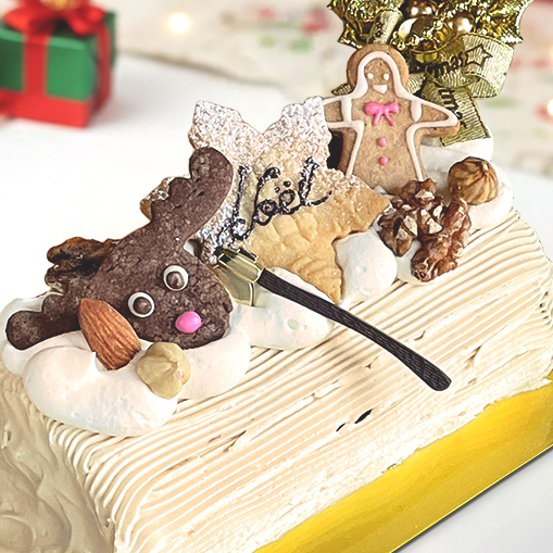 今年のブッシュドノエルは、マスカルポーネのクリームをコーヒー生地で 巻いてキャラメルクリームで幹肌に。 可愛いトナカイとジンジャークッキー、木の実と 星形の“NOEL”をそっと添えました。