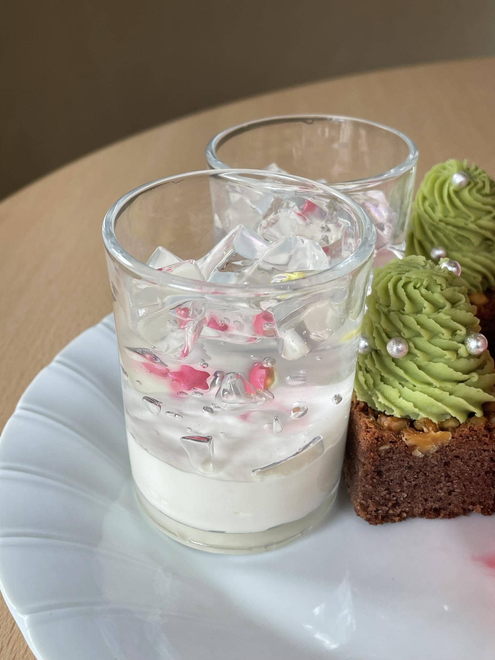 聖夜の静けさを閉じ込めたグラスデザート。雪のようにふんわりと軽やかなバニラムースに、さくらんぼの香りがほのかに広がるゼリー。星のようなアラザンが、静かにきらめきます。