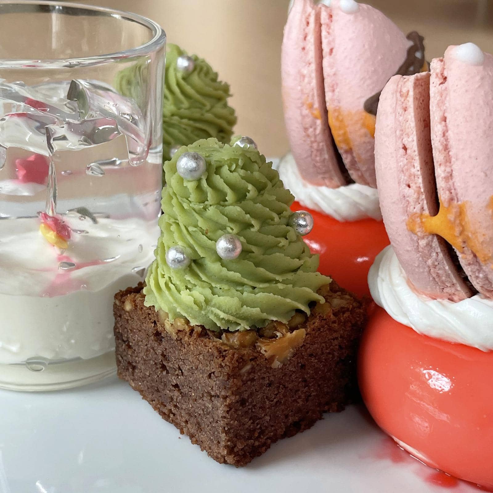 ひとくちサイズの“抹茶のクリスマスツリー”。濃厚でしっとりとしたチョコブラウニーの台座に、まるで針葉樹のような抹茶ガナッシュをツリー型に。