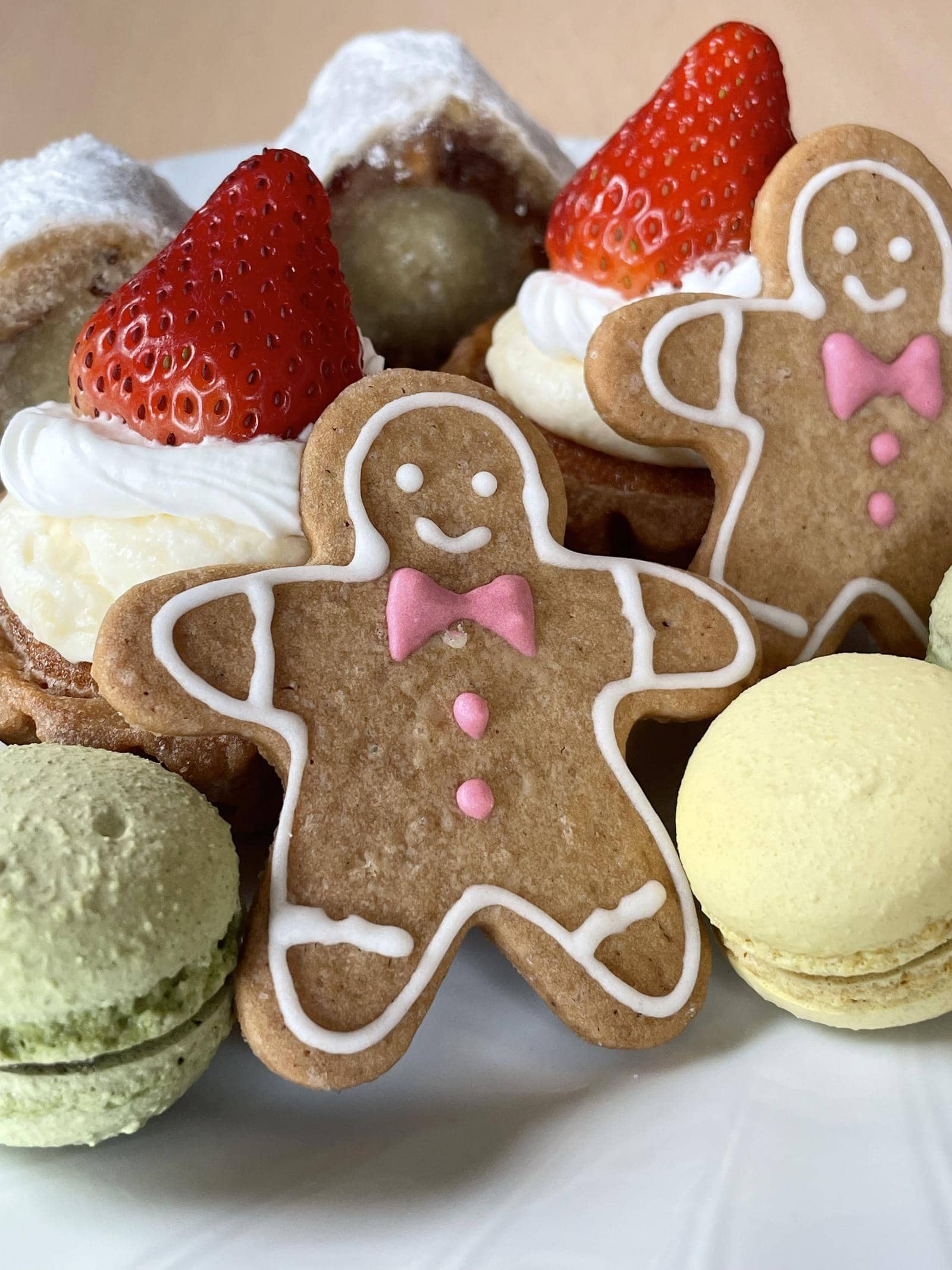 ちょこんと笑った表情とピンクの蝶ネクタイがチャーミングな、クリスマスの人気者。ジンジャーやシナモンなどのスパイスをきかせたジンジャーマンクッキー