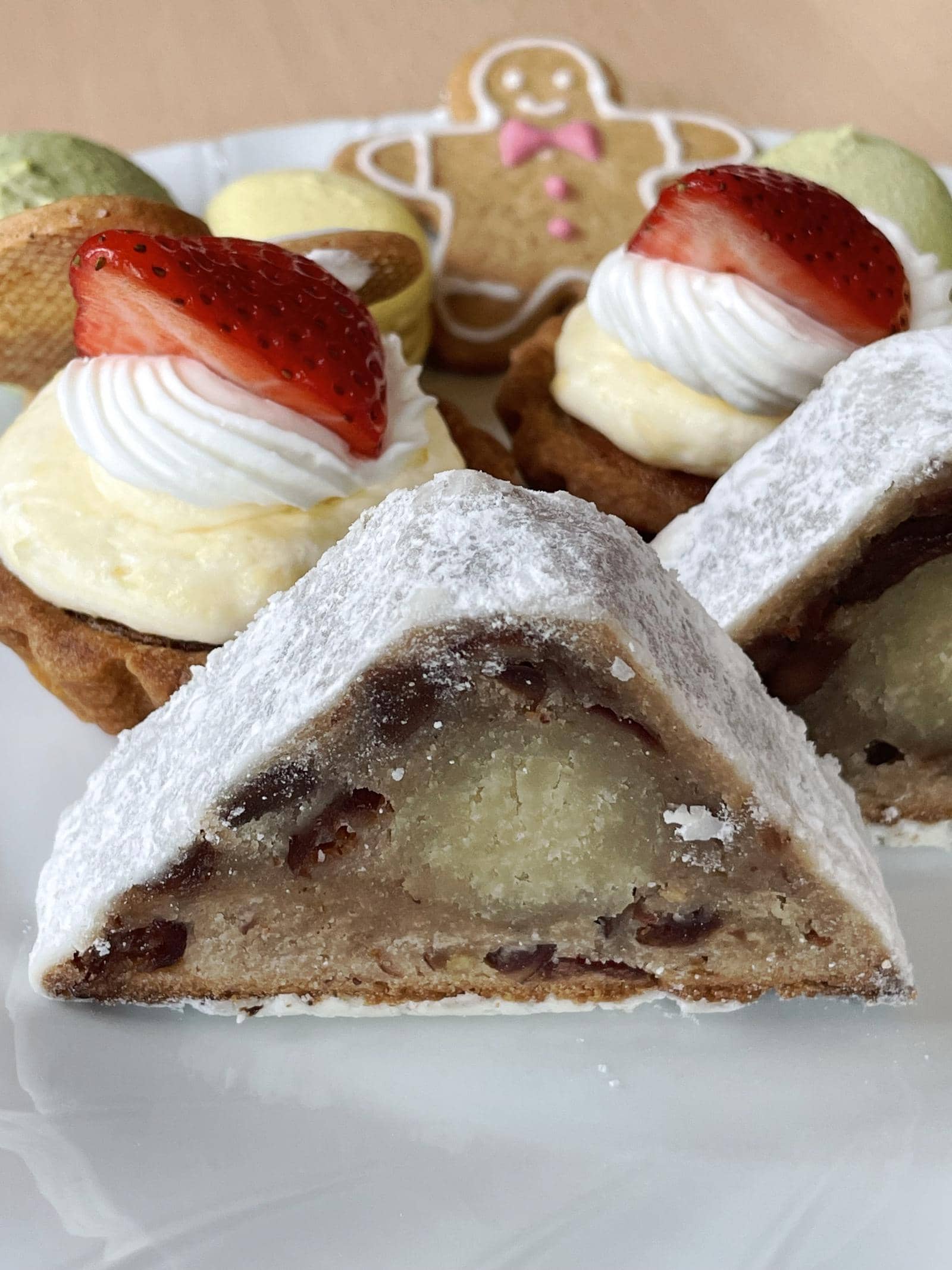 クリスマスへの喜びとともに少しずつ味わう、ドイツの伝統菓子「シュトーレン」。ドライフルーツとスパイスを効かせた生地でマジパンを包み、粉雪のような白さに仕上げました。