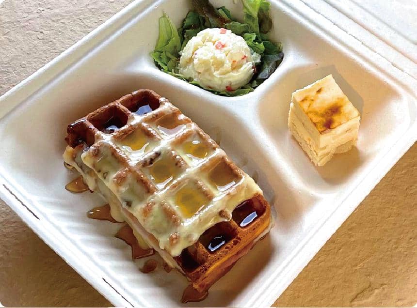ワッフルサンドに 本日のサラダ、パティシエ手作りの ミニデザートをお付けしてパックにしました。