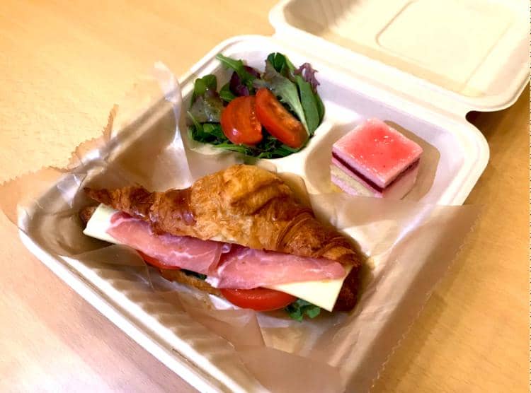 バターの香りが濃厚なビッグクロワッサンに 本日のサラダ、パティシエ手作りの ミニデザートをお付けしてパックにしました。
